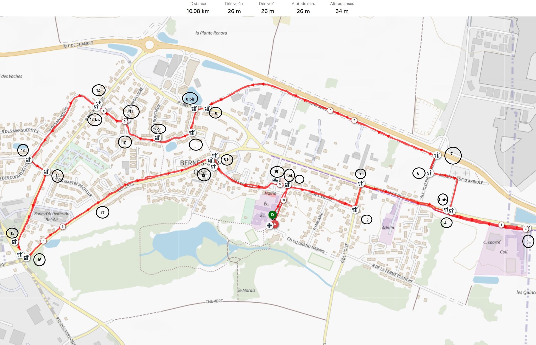 Deux parcours une boucle de 5 km et le parcours de 10,2 km en deux boucles sur la commune de Bernes sur Oise