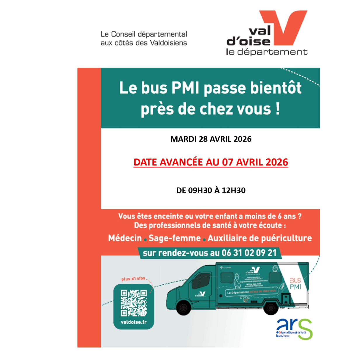 Le passage du Bus PMI du mardi 28 Avril est avancé au mardi 07 Avril.