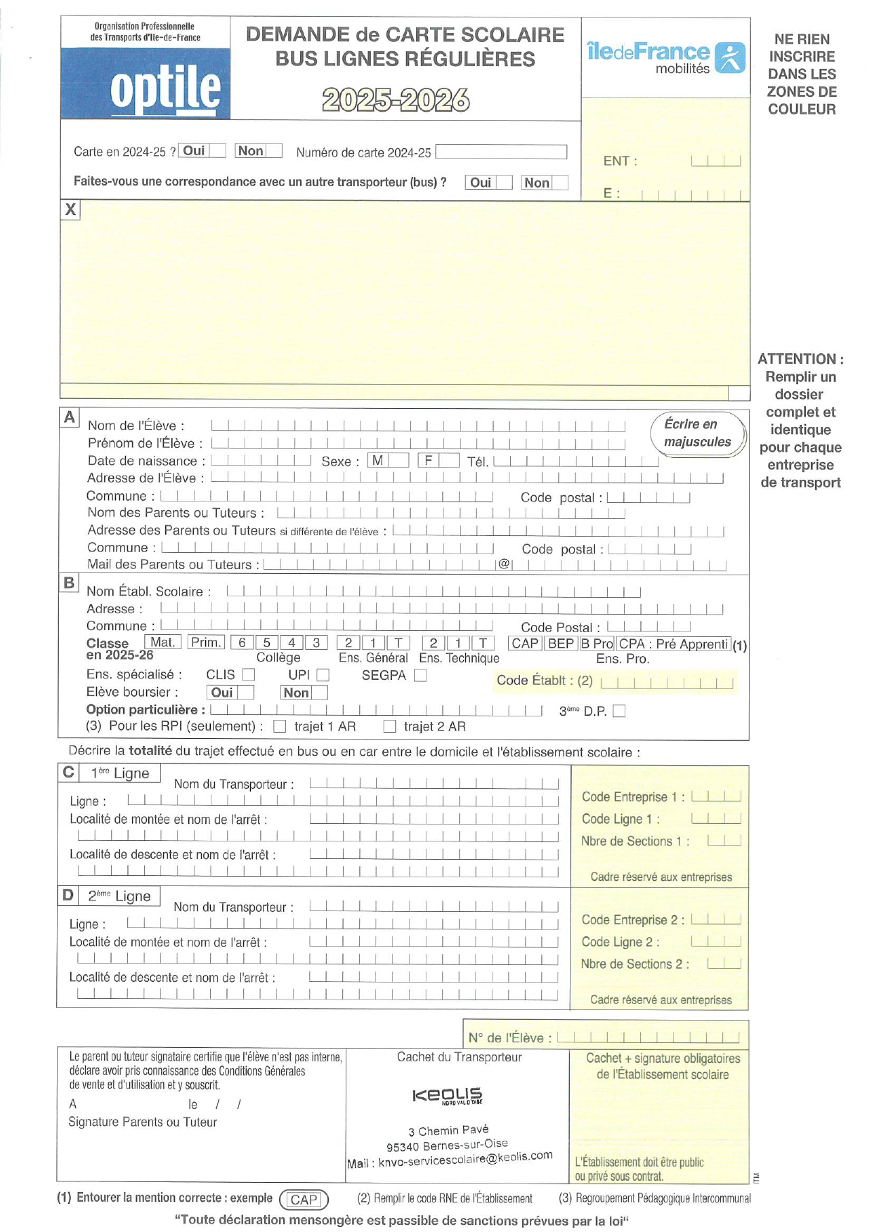 FORMULAIRES INSCRIPTION BUS SCOLAIRE LIGNES REGULIERES RENTRÉE ile de france Mobilité 2025-2026